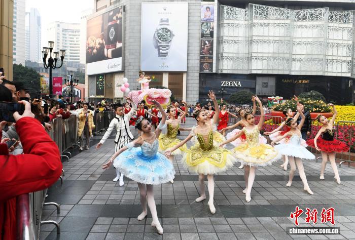 中新网重庆12月18日电 (记者钟旖)“这么近距离地观看重庆文化艺术表演,充满创意!”18日,穿过水泄不通的人群,重庆市民林林子高举手机,将镜头对准解放碑,频频按下快门。