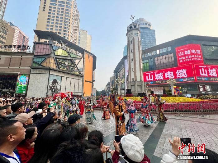 当天,由重庆市文化旅游委主办的“山城荟、艺起来”解放碑艺术巡游正式开启。来自重庆芭蕾舞团、重庆市曲艺团、重庆市川剧院和重庆艺校的120余名专业演员,将解放碑步行街变成多元的艺术舞台,为市民打造沉浸式艺术体验。