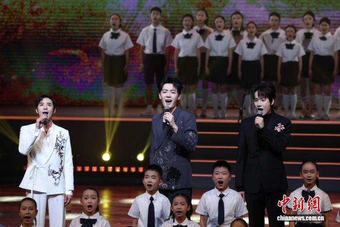 金圣权(中)、周默涵(右)、张翰(左)联袂演绎音乐剧《寻找李二狗》选段。 中新社记者 廖文静 摄