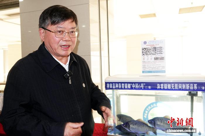 桂建芳院士介绍发布会会场外展示的鲫鱼新品种和新品系。中新网记者孙自法 摄