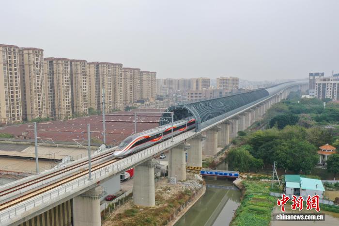 “复兴号”列车穿越广湛高铁高中立交特大桥“隔音隧道”。李佳珊摄