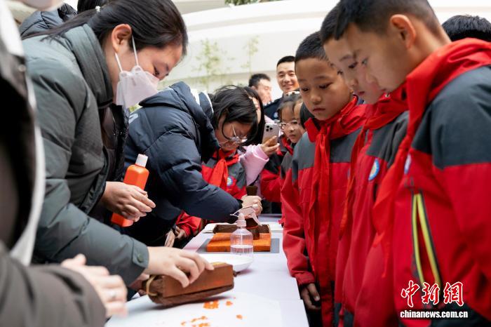 1月6日,“千古巨制——《四库全书》展进警营主题展览”活动举行,兰州新区第三小学学生在活动中学习拓印步骤。王翔宇 摄