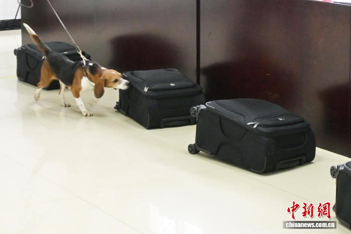来自北京海关的工作犬首先对禁止进境的种子和异宠进行了搜检演示。参与考核的工作犬在训导员引导下,机敏穿梭于行李箱包之间,一旦发现可疑气味,立刻蹲坐示警,从50个箱包中精准识别出禁止进境的动植物产品等多种目标物品。在专家组考官的见证下,工作犬均以优异表现通过考核。