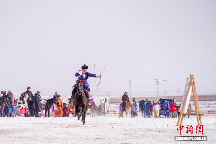 朔风卷雪,铺就茫茫草原,一场跑马射箭比赛在此进行。百米赛道以颜料勾勒于白雪之上,两道靶位静静伫立。赛事规则极简却极具挑战:骑手需策马奔腾间,连拔劲箭、精准射靶,时间限定为10秒钟,一轮定输赢。