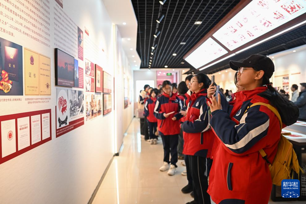 2月4日,内蒙古大学附属中学学生在内蒙古呼和浩特市和林格尔土城子国家考古遗址公园剪纸陈列馆参观。