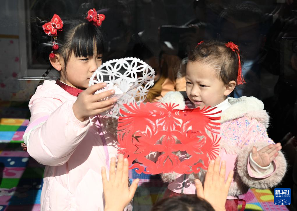 2月4日,在内蒙古呼和浩特市和林格尔土城子国家考古遗址公园剪纸陈列馆,两名儿童在观看剪纸创作。