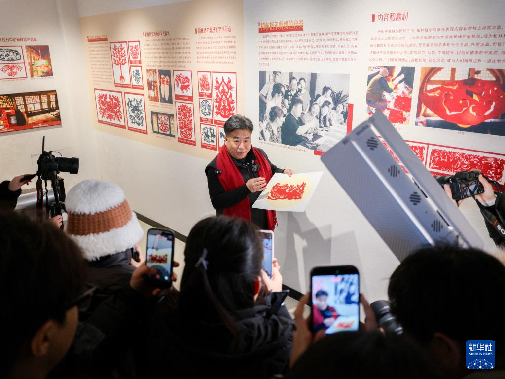 2月4日,和林格尔剪纸国家级非物质文化遗产代表性传承人段建珺(中)在内蒙古呼和浩特市和林格尔土城子国家考古遗址公园剪纸陈列馆向观众介绍和林格尔剪纸。