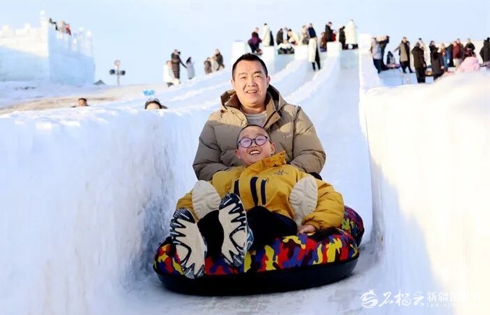 阿勒泰冰雪主题乐园中,父子同玩雪滑梯。宋湖拉·沙布尔江摄