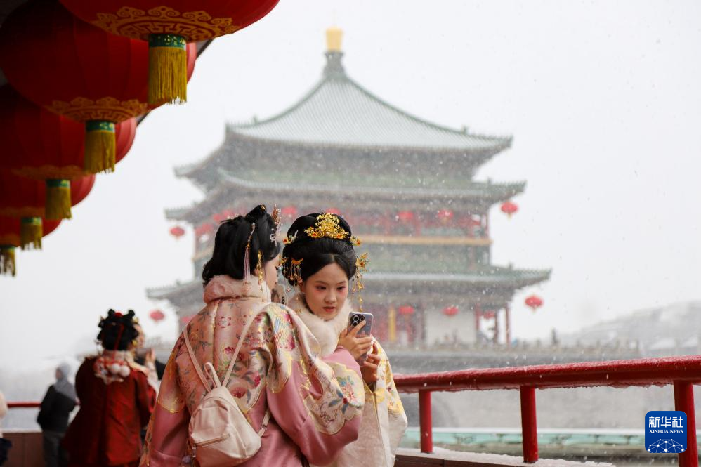 2月23日,游客在陕西省西安市钟楼旁赏雪拍照。