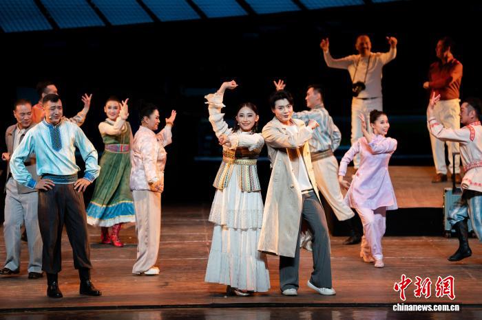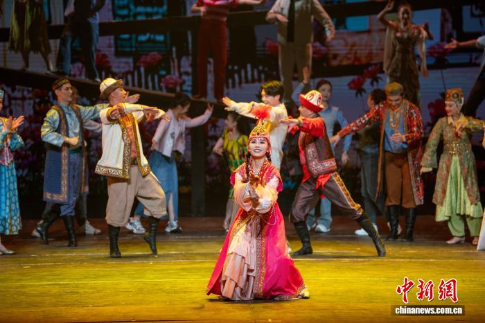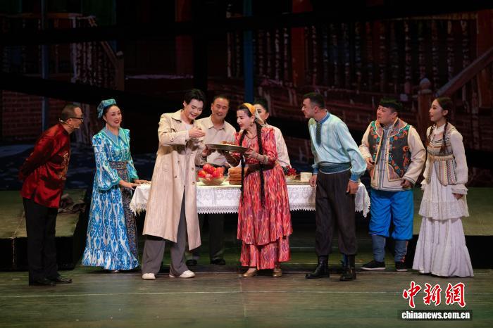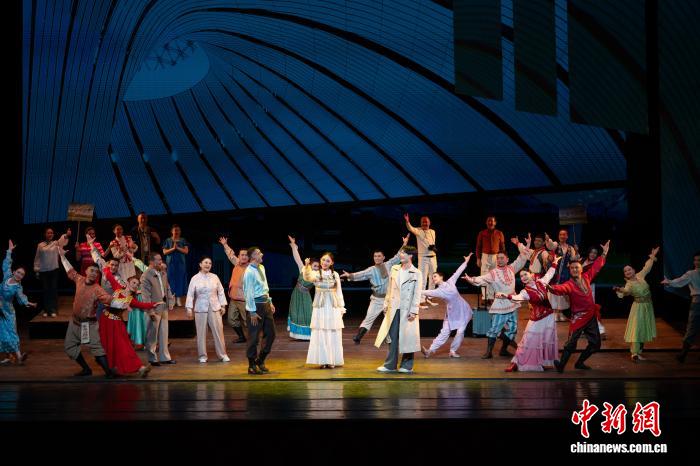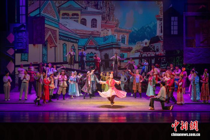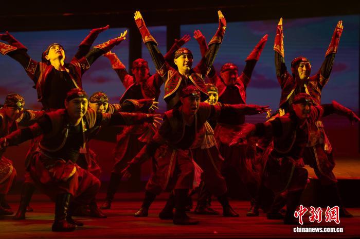 3月26日晚,原创现代歌舞剧《天山问渠》在新疆艺术剧院上演。作为第四届新疆文化艺术节展演剧目之一,该剧由伊犁州歌舞剧院60余位演员演绎。作品以“问”为魂,通过青年学子林一与林则徐的跨时空对话,既展现林公兴修湟渠的担当精神,又诠释新时代青年的价值选择。该剧以艺术为纽带传递江苏新疆深情,生动诠释民族团结的深厚内涵与昂扬向上的时代精神。图为演出现场。赵凯摄
