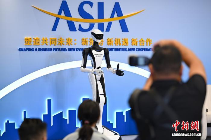 3月25日,海南博鳌,机器人作为辅助主持人亮相博鳌亚洲论坛2026年年会“人形机器人的进阶与飞跃”分论坛。中新社记者 田雨昊摄