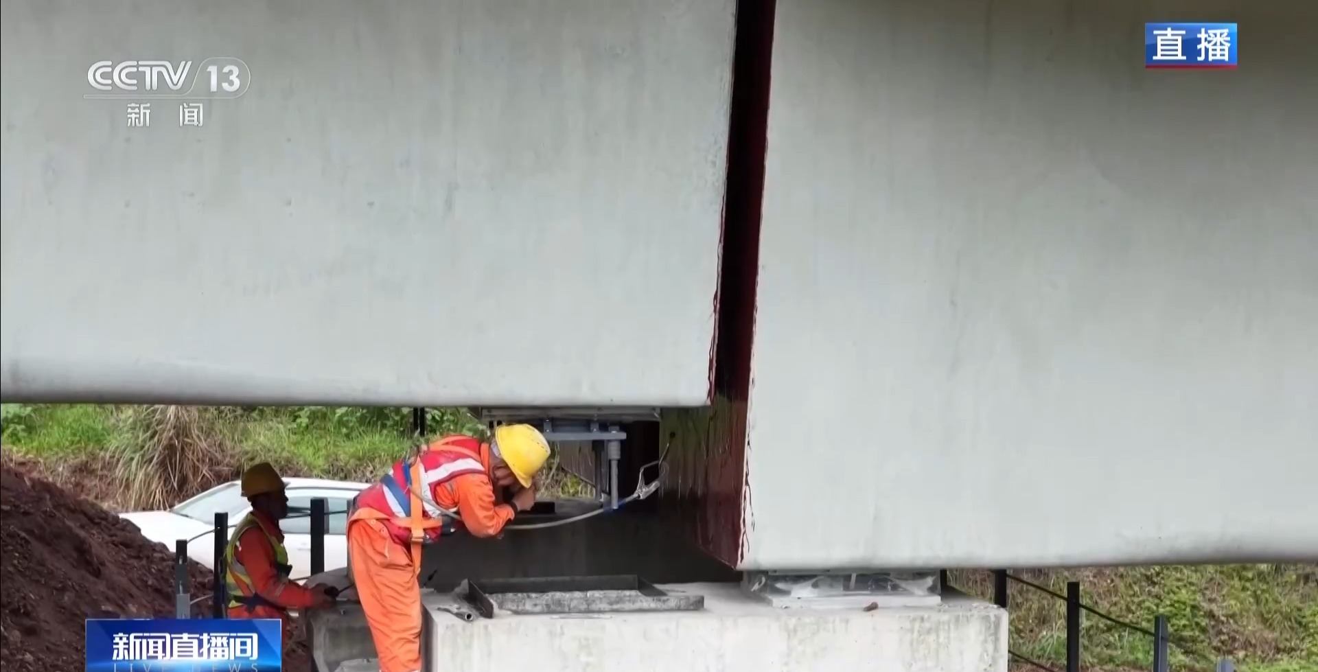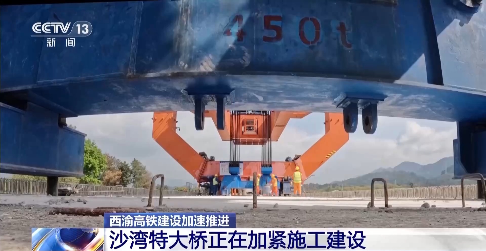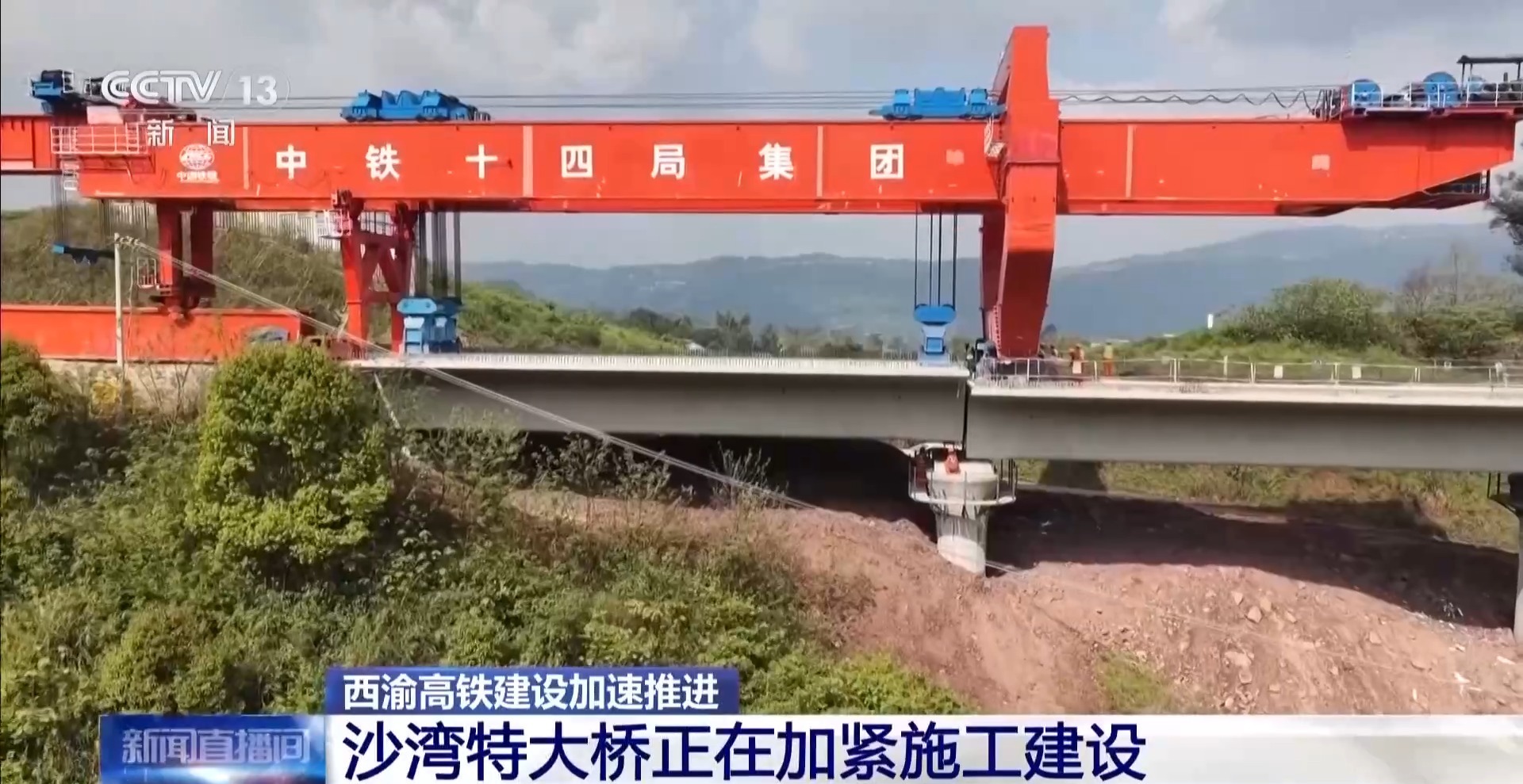 总台记者 王磊:在沙湾特大桥建设现场,这台巨大的“架桥机”正在吊装的是大桥“脊梁骨”——我们叫它预制梁。