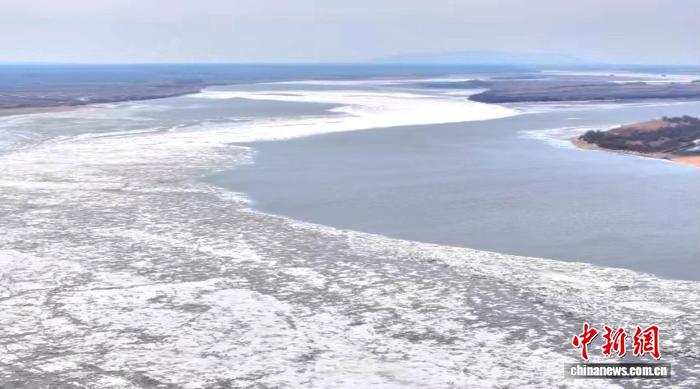 随着“赫哲故里”同江气温不断回升,松花江和中俄界江黑龙江交汇处江面呈现出“半江春水半江冰”罕见景观。 同江市委宣传部供图
