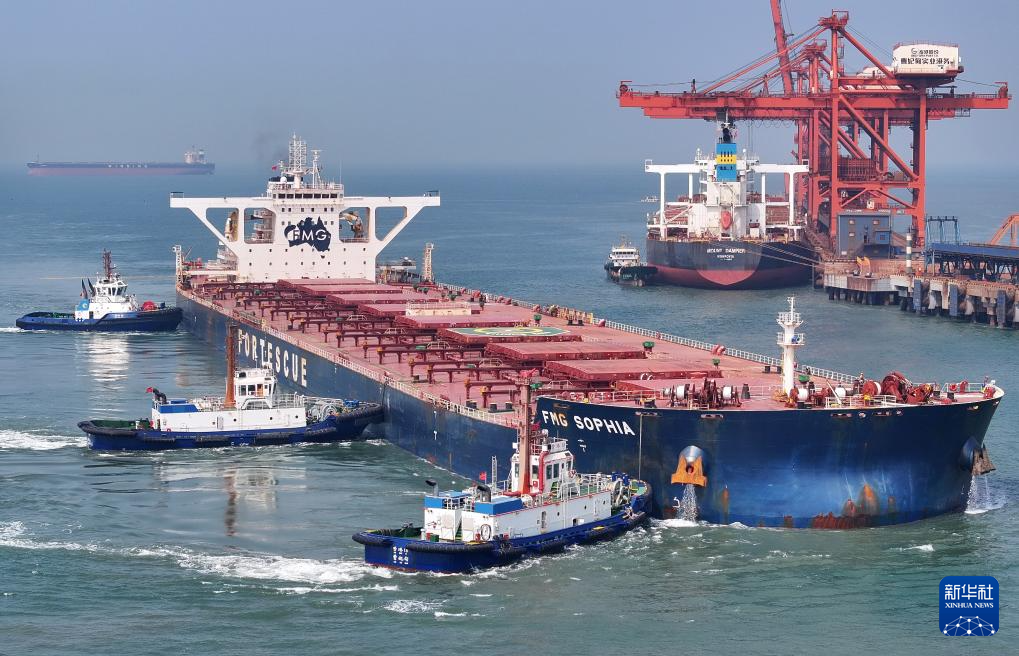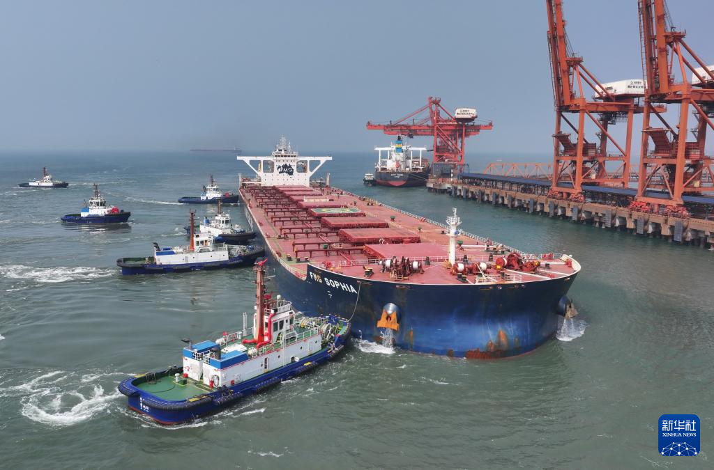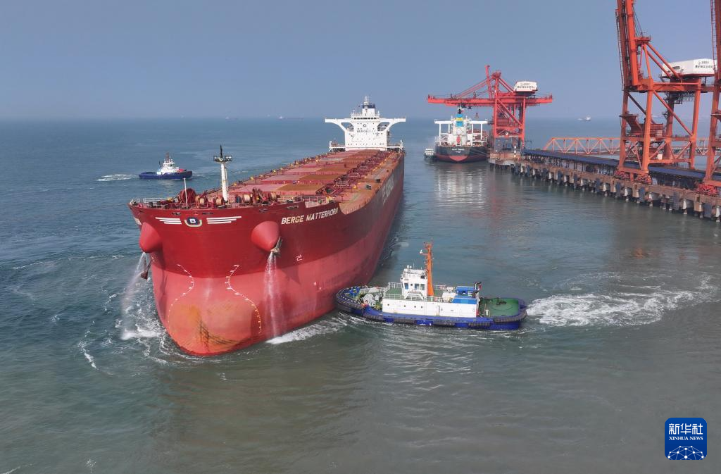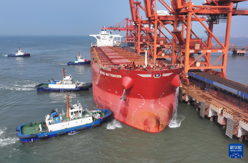 4月15日,一艘轮船在拖轮协助下向唐山港曹妃甸港区矿石码头靠泊(无人机照片)。
