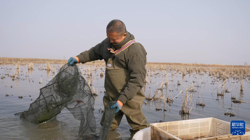 在盱眙县黄花塘镇一个养殖基地,养殖户在捕捞小龙虾(2025年12月摄)。