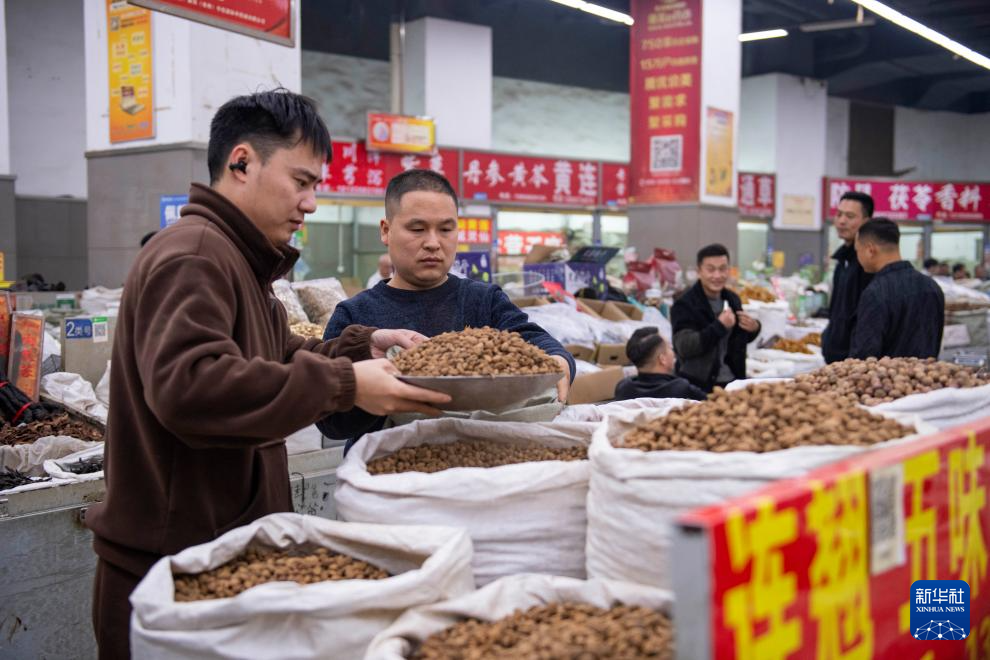 11月10日,药商在亳州中药材专业市场分装中药材。