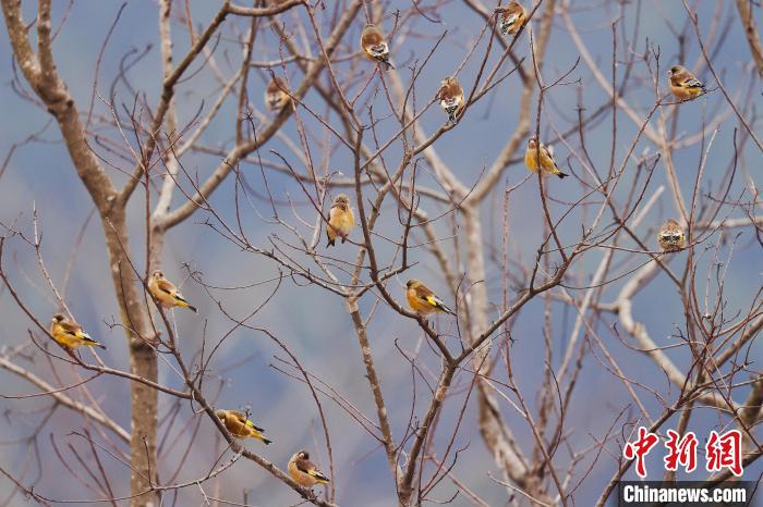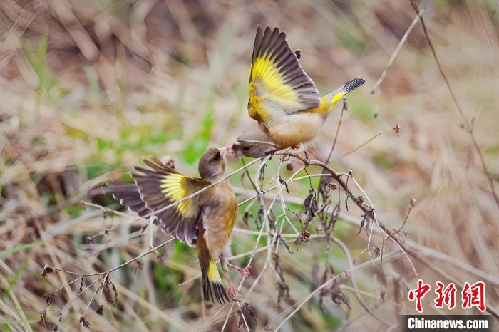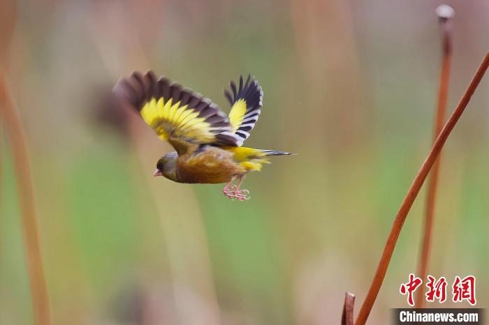 中新网合肥2月24日电 (储玮玮)日前,摄影爱好者在安徽省黄山市祁门县祁山镇芳村村拍摄到了成群的金翅雀在荷塘间翩翩起舞的画面。