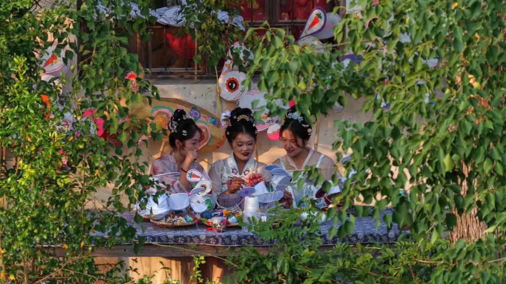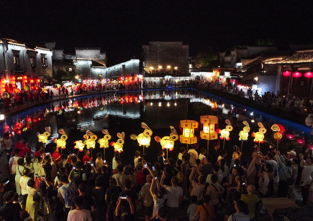 10月5日,在安徽省黄山市黟县宏村,游客在制作花灯(无人机照片)。新华社发(汪澄摄)