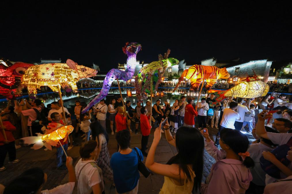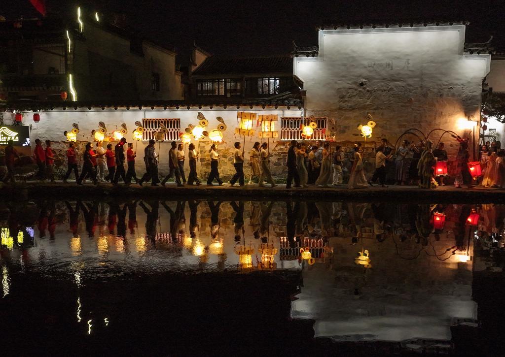 10月5日,花灯表演队伍在安徽省黄山市黟县宏村巡游。新华社发(樊成柱摄)