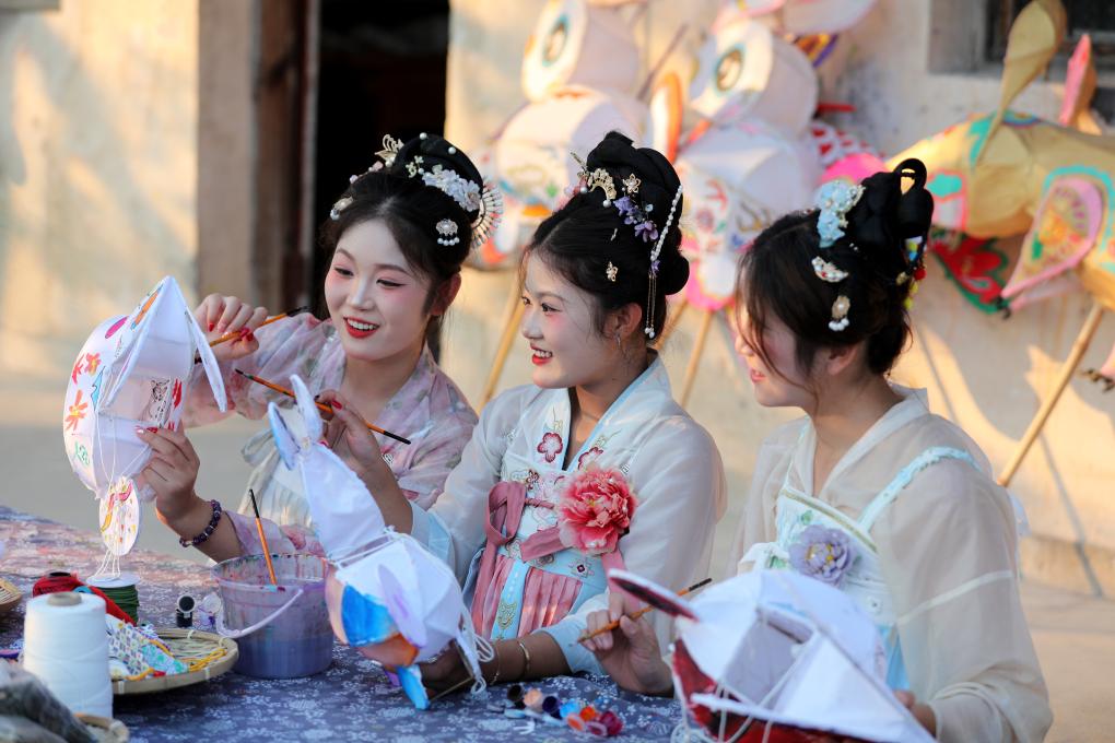 10月5日,在安徽省黄山市黟县宏村,游客在制作花灯。新华社发(樊成柱摄)