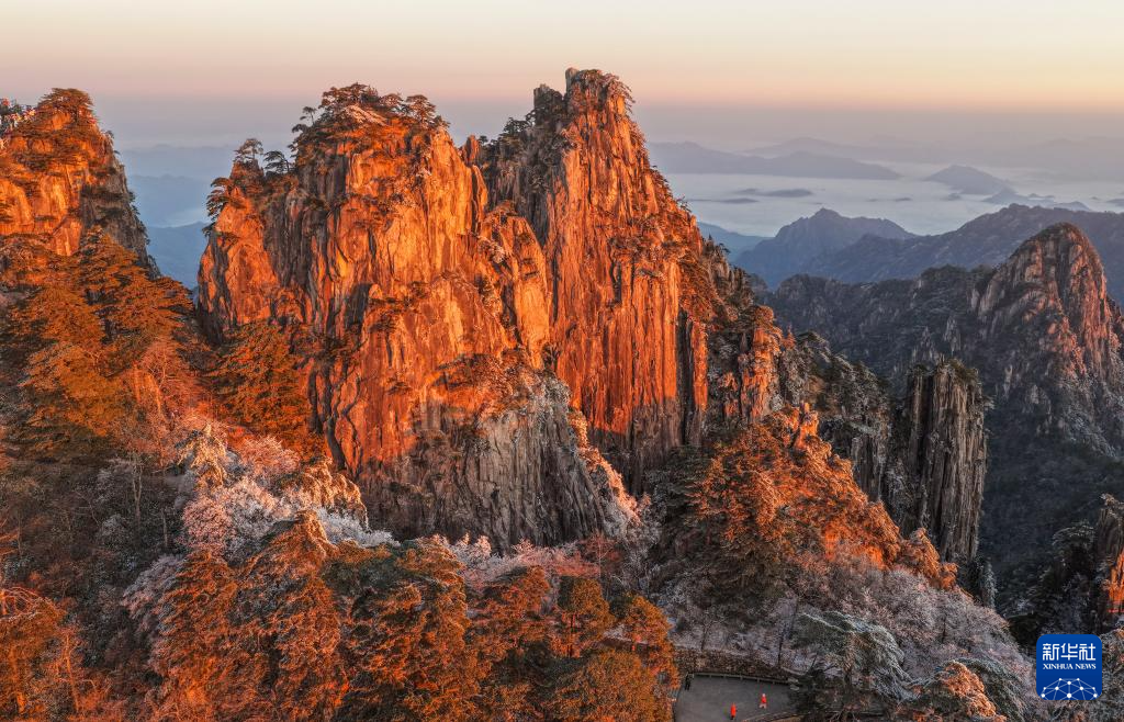 雪后初霁的安徽省黄山风景区银装素裹,初升的朝阳与奇松、怪石交相映衬,吸引众多游客前来赏雪观景。