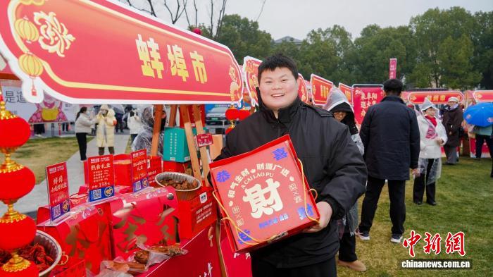 1月25日,来自蚌埠的商户在展示自己的产品。中新社记者 张强摄