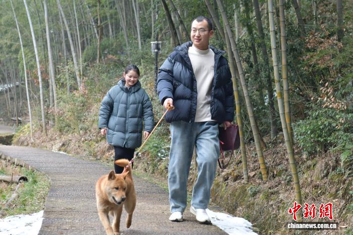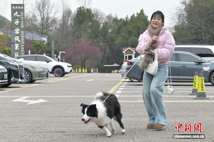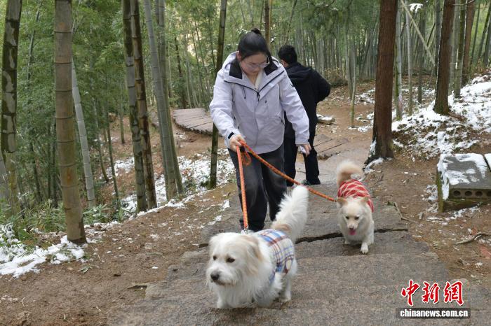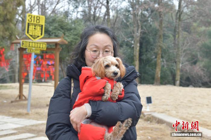 2月9日,安徽省池州市青阳县九子岩风景区,游客带宠物游玩。中新社记者 储玮玮 摄