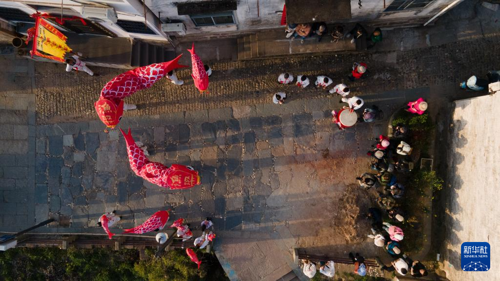2025年3月24日,在安徽省黄山市歙县徽城镇渔梁社区,人们在观看当地鱼灯队表演(无人机照片)。