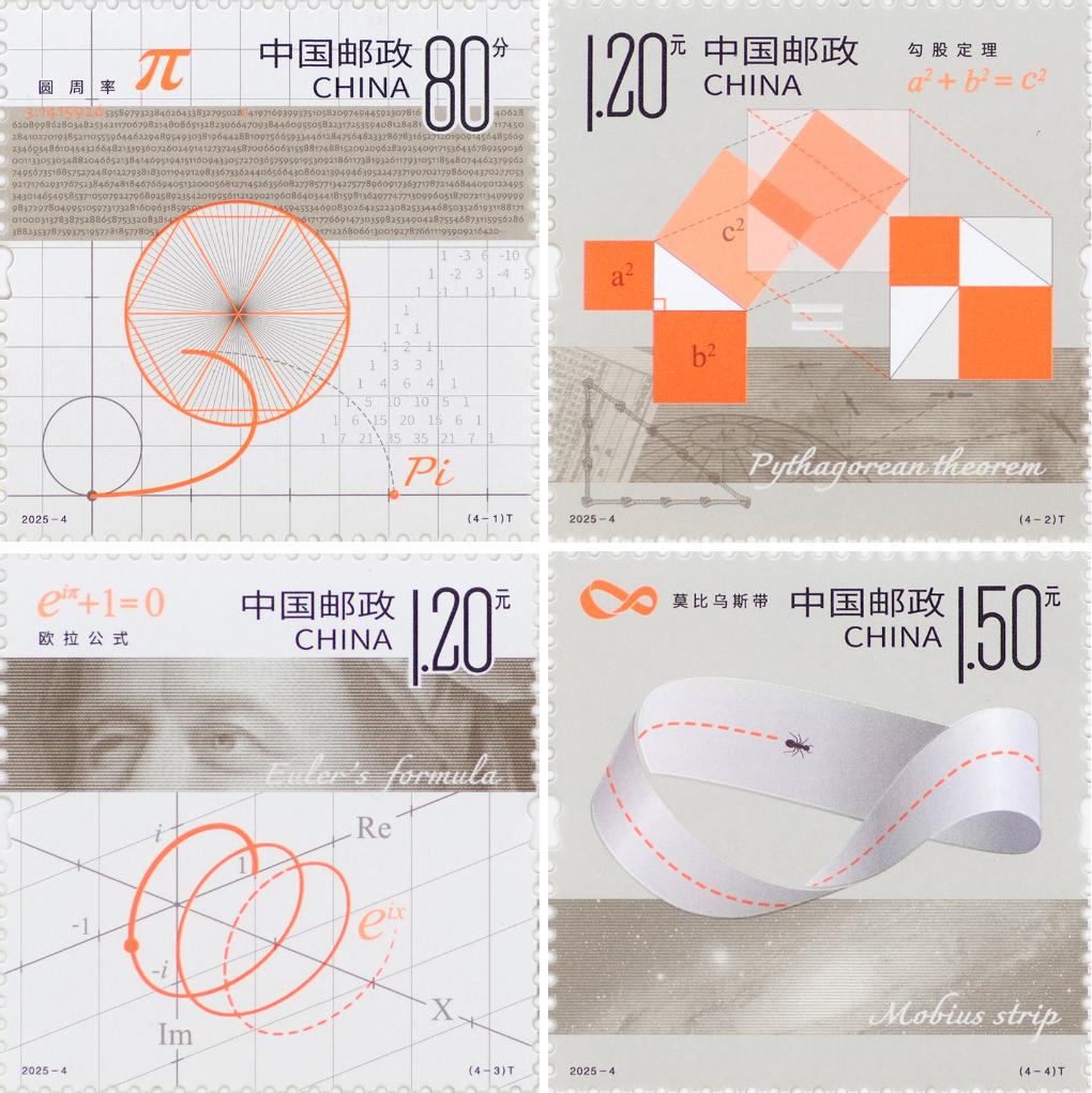 《数学之美》特种邮票1套4枚,邮票图案名称为:圆周率、勾股定理、欧拉公式、莫比乌斯带。全套邮票面值4.70元。