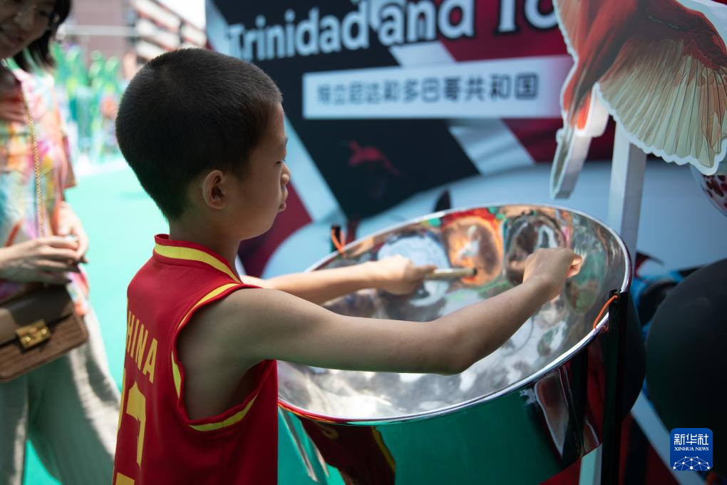 6月15日,一个孩子在2025年加勒比文化体验活动上体验加勒比地区传统乐器铜鼓。