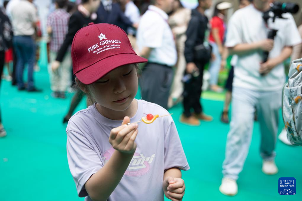 6月15日,一个孩子在2025年加勒比文化体验活动上品尝特色美食。