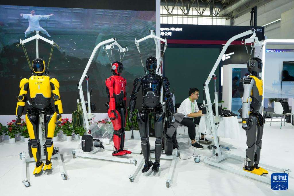 7月14日,在第三届中国国际供应链促进博览会数字科技链展区的“湖北人形机器人产业链专题展区”,工作人员在布置展品。