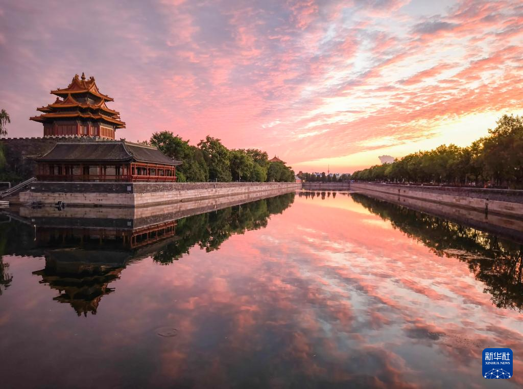 晚霞中的北京故宫东北角楼(手机照片,7月20日摄)。