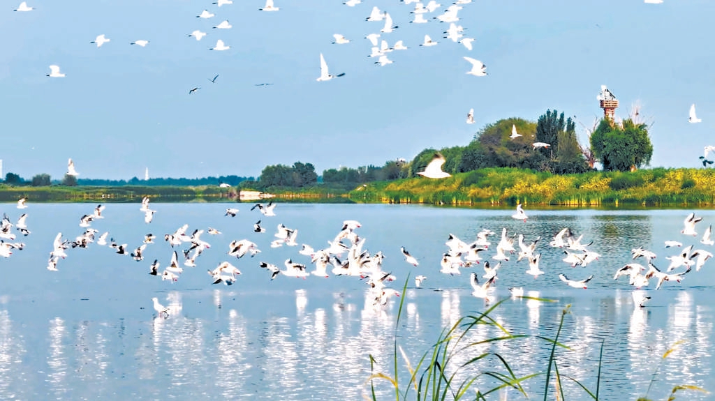 于是,在七里海湿地核心区水域,一座总面积约400平方米的人工岛建成,上千只珍稀候鸟在这里悠闲栖息,时而自由翱翔,时而散步嬉戏。这座人工建造的漂浮鸟岛,包含燕鸥、燕鸻等鸟类筑巢繁殖的卵石区、满足鸟类隐蔽栖息和育雏的水生植物区和方便水鸟觅食的鱼巢区。“自从有了鸟岛,这里很快就成了候鸟繁衍生息的新家。鸟岛上已有2000余只燕鸥、燕鸻、金眶鸻等珍稀鸟类驻足,搭建有20余个鸟巢,共孵化幼鸟60余只。”田秀静介绍。(记者韩梅)