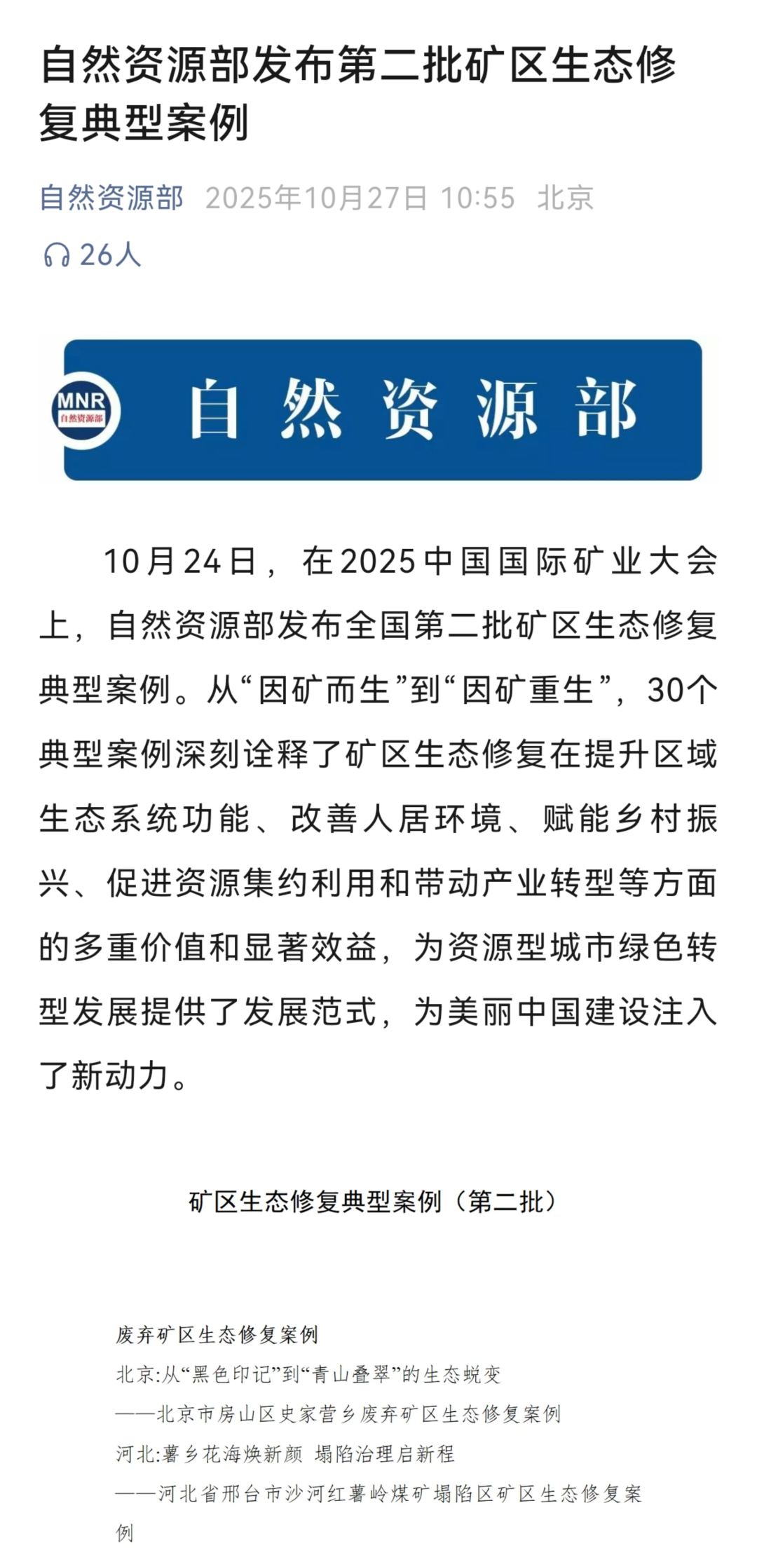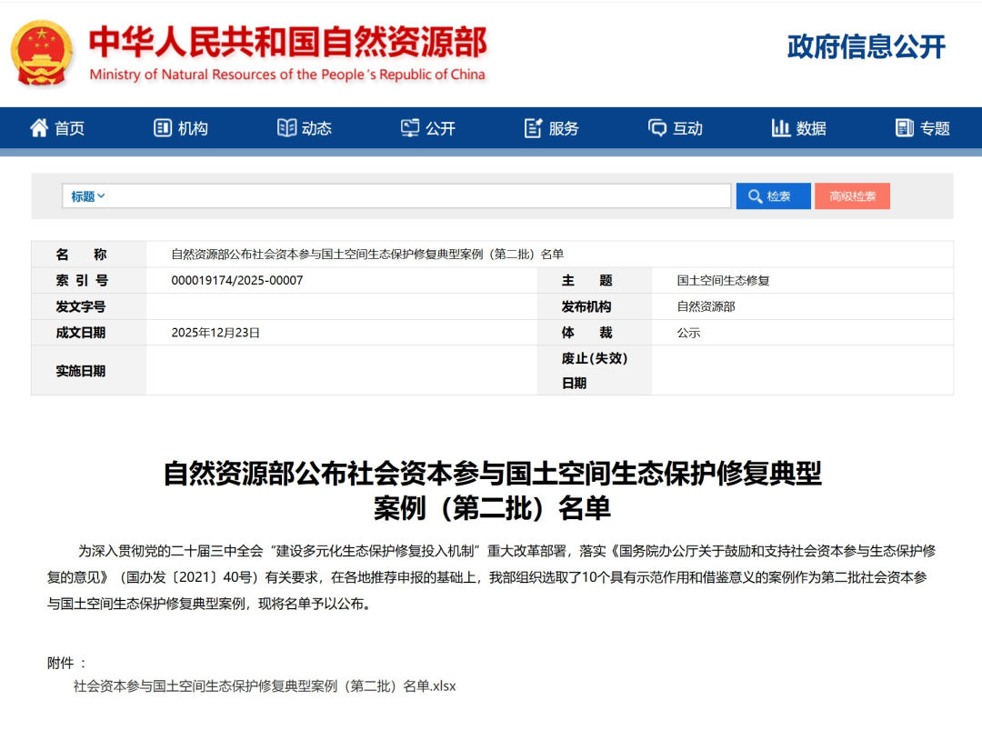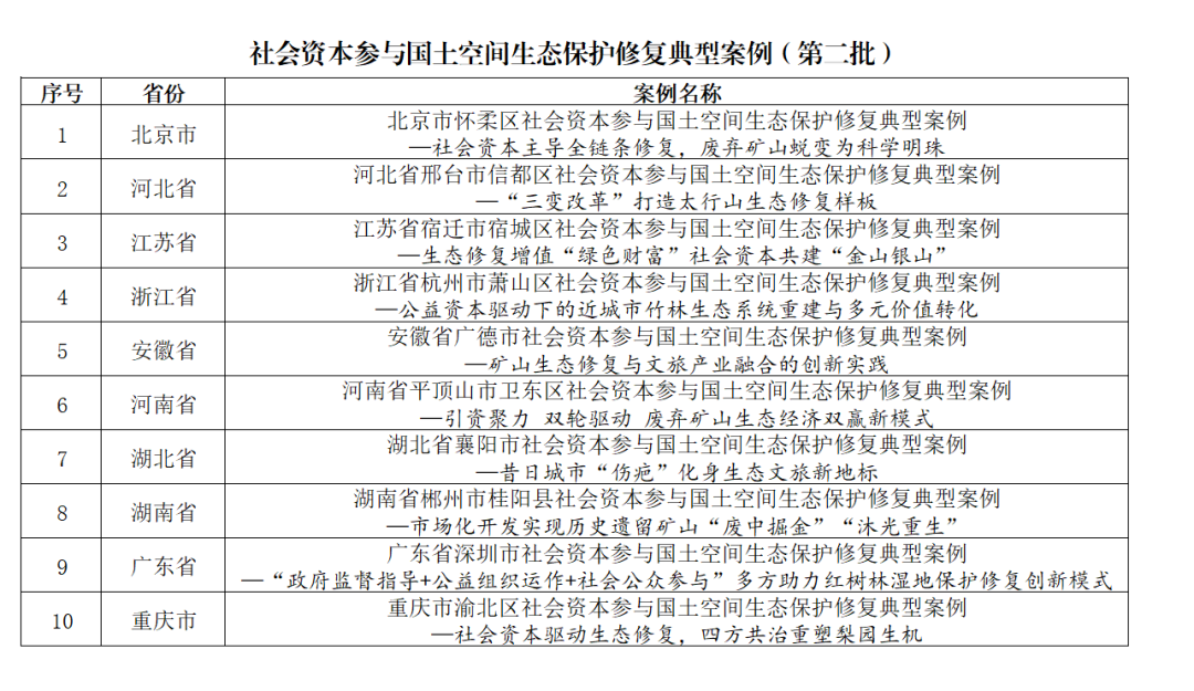 此次入选自然资源部社会资本参与国土空间生态保护修复典型案例,是继入选国土空间生态修复创新适用技术名录(第二批)、矿区生态修复典型案例、2025自然资源新媒体传播案例后,本市国土空间生态修复领域相关工作在2025年内再一次获得上级部门认可。