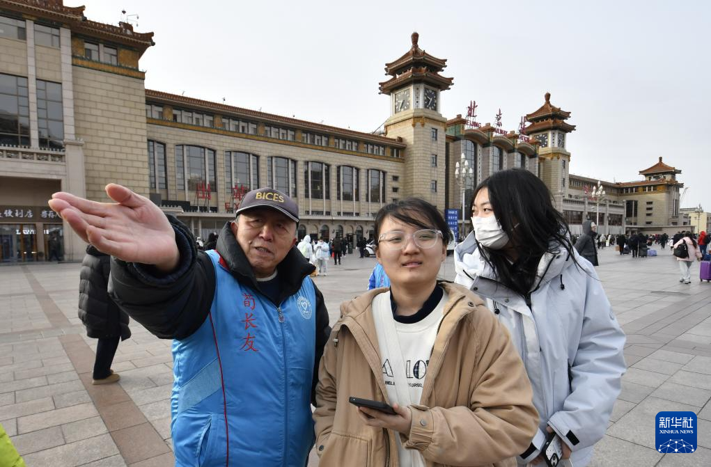 2月6日,北京市东城区建国门街道站东社区党员义务指路队的老队员带领十余名小学生志愿者在北京火车站广场开展春运志愿服务活动,为出行旅客提供换乘、乘车、购票指导等服务。