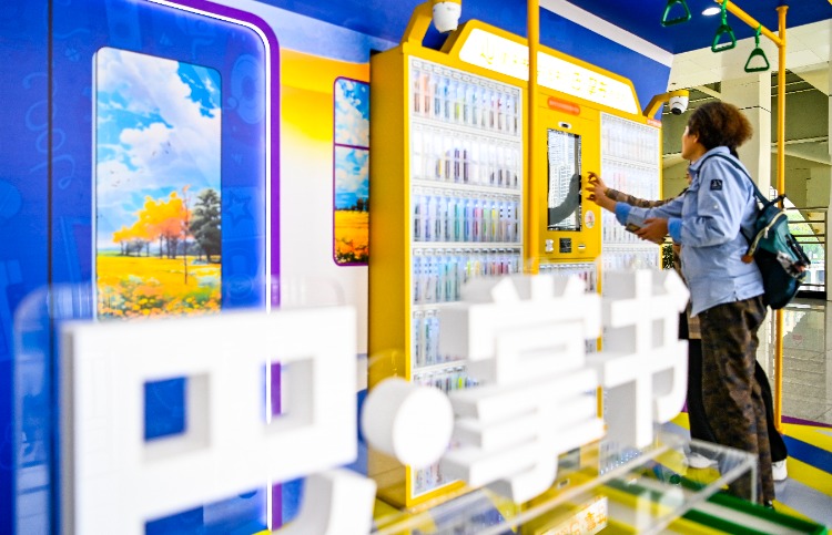 ▲市民体验“巴·掌书”借阅柜。记者 齐岚森 摄