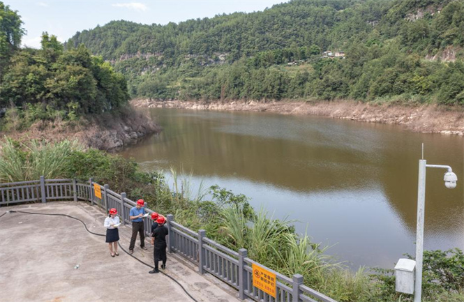 8月13日,在重庆市开州区九龙山镇天白水库,重庆三峡银行开州支行工作人员(左二、左一)进行贷后回访,实地了解项目建设进度。新华社记者黄伟 摄