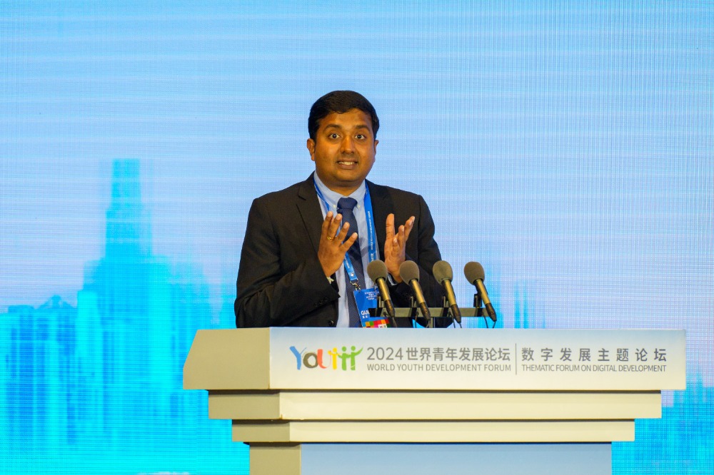 ▲8月15日,2024年世界青年发展论坛现场,联合国开发计划署亚太青年问题专家萨文达·拉纳松加作主旨演讲。记者 李雨恒摄