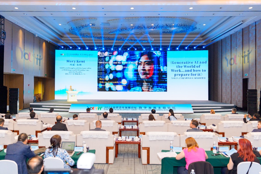 ▲2024年世界青年发展论坛现场,国际劳工组织助理总干事玛丽·肯特做主旨演讲。记者 李雨恒 摄