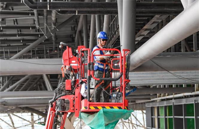 8月17日,中铁建工工人在重庆东站站房及配套综合交通枢纽工程二标段项目作业。
