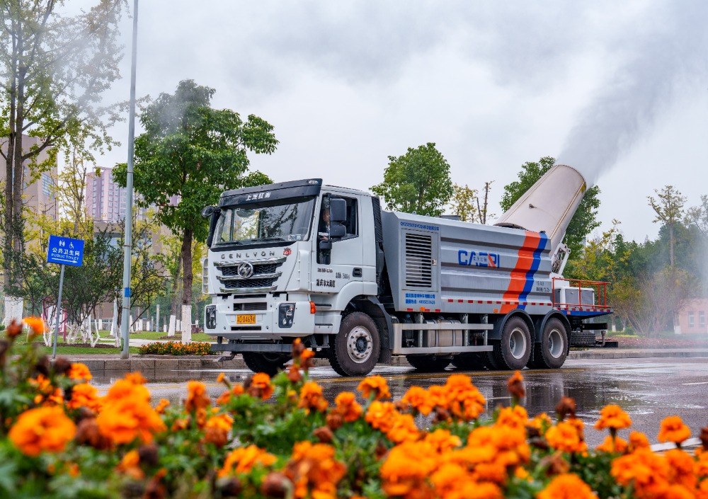 ▲2024年11月22日,重庆市双桥经济技术开发区,雾炮车在进行流动降温、降尘作业。记者 李雨恒 摄