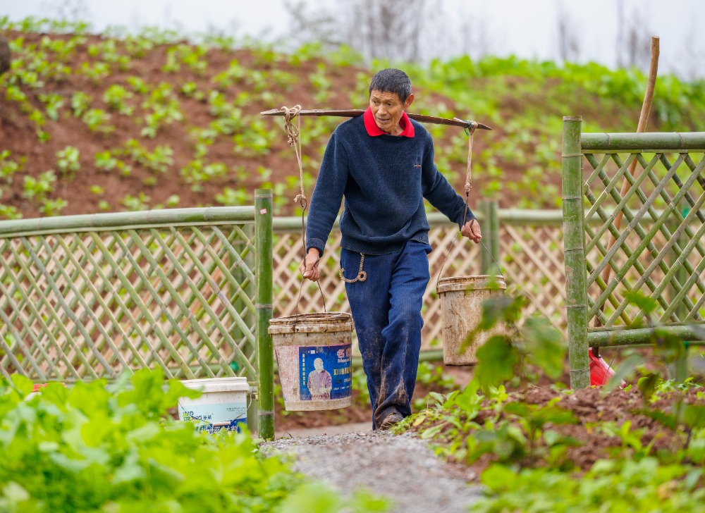 ▲2024年11月22日,重庆市双桥经济技术开发区消防文化主题公园对面的一块菜地中间,居民在一口田间池旁领“肥”。记者 李雨恒摄