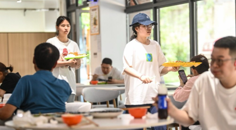 ▲6月23日,九龙坡区黄桷坪街道邮电支路社区综合体食堂,众多年轻人来此就餐。记者 郑宇 摄