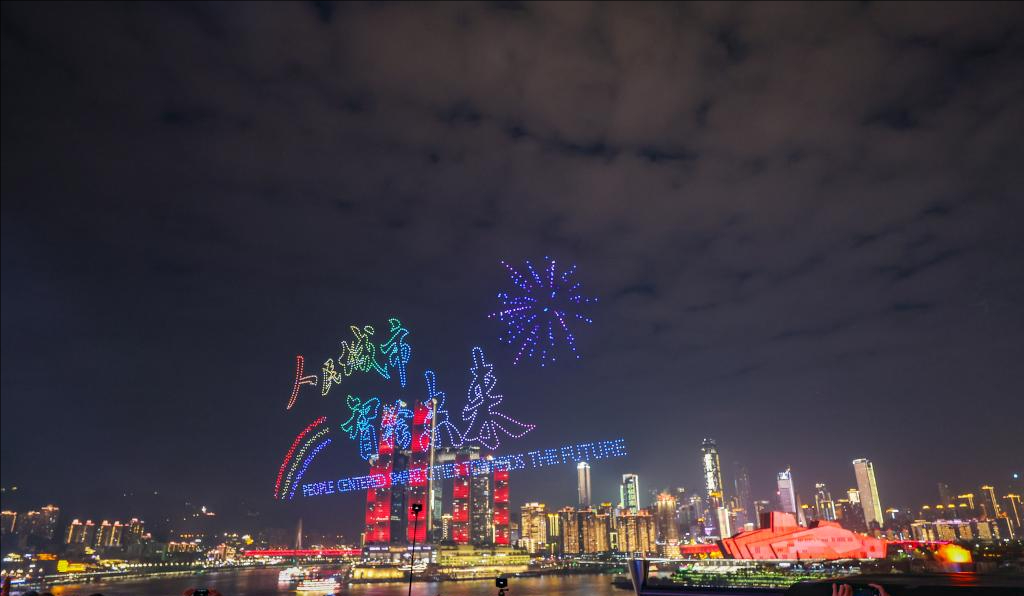 10月27日晚,“新韵重庆”无人机灯光秀举行世界城市日专场表演活动,数千架无人机以“人民城市智绘未来”为主题,在重庆夜空勾勒出智慧与温情交织的城市图景。