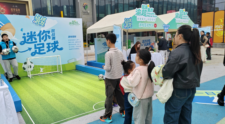 现场还有游戏互动专区,扔沙包答问题、迷你足球挑战等,吸引了众多市民参与。胜出者分别获得了重庆铜梁龙冲超名将黄希扬亲手签名的帽子、球衣和足球。