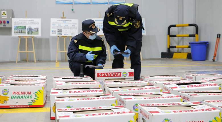 重庆港海关关员在对进口香蕉进行现场查验。受访单位供图
