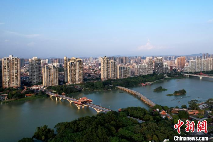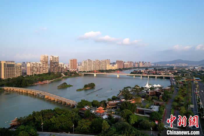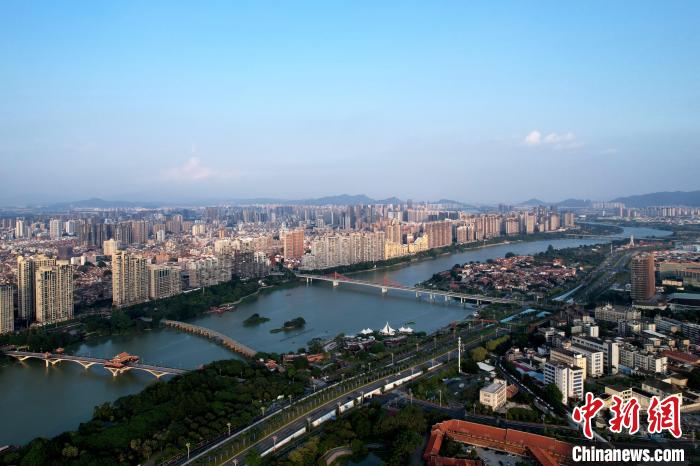 10月15日,空中航拍福建漳州九龙江畔。漳州是中国著名侨乡,是台胞主要祖籍地、闽南文化重要发祥地和台商投资密集区。图为地处九龙江西溪北岸的漳州古城。(无人机照片)中新社记者张金川 摄