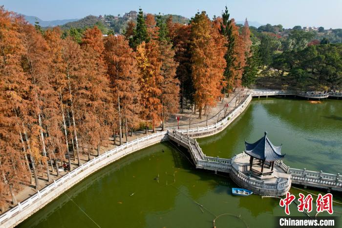 1月6日,空中俯瞰福州国家森林公园“换装”变红的水杉林,宛如大自然精心布置的调色板,成为冬日里一道别致的风景线。(无人机照片)中新社记者王东明 摄