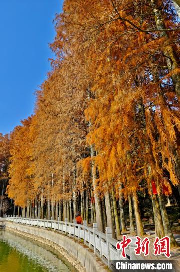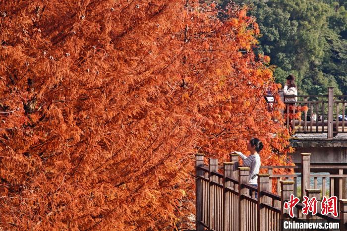 1月6日,游客观赏红色水杉林。近日,福州国家森林公园水杉林换上红色“新装”,成为冬日里一道别致的风景线。中新社记者 王东明摄